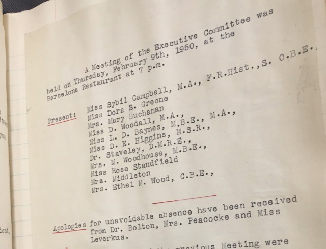 Dora was treasurer for a number of years. Sybil Campbell (1889-1977) was a barrister and became Britain’s first female judge in 1945. She studied at Girton College, Cambridge. Miss LD Baynes was Assistant Principal at the War Office in the Second World War. Miss Dorothy Higgins (1892-1970?) was a radiographer and close friend of Dr Dulcie Staveley (1898-1985) who was the Royal Free Hospital’s first woman radiologist. Rose Standfield was a professional singer. Gertrude Leverkus (1899-1976) was a pioneering architect, qualifying from UCL in 1919.