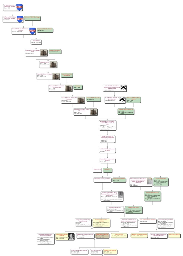 My great, great grandfather and Dora’s grandfather was Dr John Boyd, MP for Coleraine in Northern Ireland in the mid 19th century. My post about searching for his grave led to contact from a historian of the Boyd family. He recently shared with me a family tree going back to Sir Robert Boyd (died 1333), who was a knight of Robert the Bruce. King Robert gifted land near West Kilbride in Ayrshire to his faithful knight after victory at Bannockburn and the Boyds built a castle there. Portencross castle still stands today!