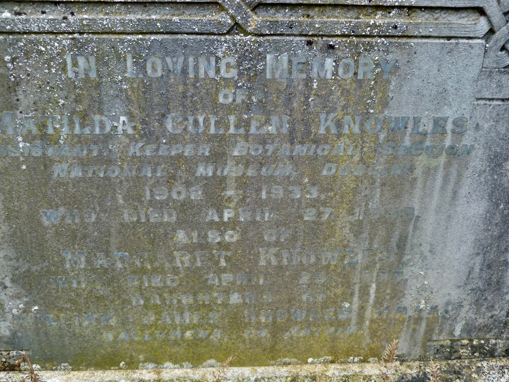 Matilda Cullen Knowles (1864–1933) was born at Cullybackey, near Ballymena in Northern Ireland. Her father, William James Knowles MRIA, was a naturalist and antiquarian.The family regularly visited archaeological sites together, but even as a young girl Matilda was more interested in botany. She attended natural science classes in the Royal College of Science in Dublin, and in June 1902 went to work in the Botanical Section of the Science and Art Museum in Dublin (now the National Museum). She was appointed assistant to the Head of Botany in 1907 and was in charge of the botanical collections from about 1923. Knowles had far-reaching influence in the field of Irish botany as she had a “wide knowledge of all matters relating to Systematic Botany.” Under her curatorship, botanists from all over the world consulted the herbarium, corresponded with her and sent specimens. Her Handlist of Irish flowering plants and ferns had two editions; a third edition, in Irish, appeared after her death.